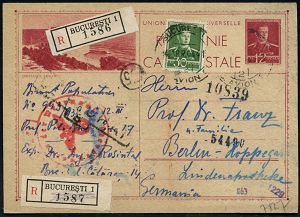 1700 | 20 € | DIE ACHSENMÄCHTE: DEUTSCHES REICH / ITALIEN / JAPAN / FINNLAND / BULGARIEN / KROATIEN / SLOWAKEI / UNGARN / RUMÄNIEN u. : RUMÄNIEN 1941 (14.4.) 12 L. BiP dkl.rot: Constanta + Zusatzfrankatur (1 Mke von der Zensur abgelöst) doppelt gezettelt: BUCURESTI 1 + roter OKW-Zensur-1K (= Wien), Ausl-R-Zensur-Kt. n. Berlin-Hoppegarten, rs.AS (Mi.P 124 etc.) | ![]() ![]() | |