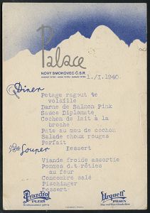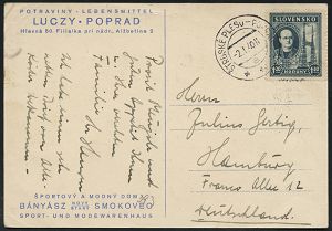 1701 | 20 € | DIE ACHSENMÄCHTE: DEUTSCHES REICH / ITALIEN / JAPAN / FINNLAND / BULGARIEN / KROATIEN / SLOWAKEI / UNGARN / RUMÄNIEN u. : SLOWAKEI 1940 (2.1.) 1,20 Kr. "10. Todestag J. Murgas", EF = Radio-Pionier , klar gest. (STRBSKE PLESU) Color-Einladungskarte: LUCZY - POPRAD.. SPORT U. MODEWAREN (silber/blau) mit Speisekarte u. Bier-Reklame!, Ausl.-Kt. ohne Zensur n. Hamburg (Mi.47 EF) | ![]() ![]() | |