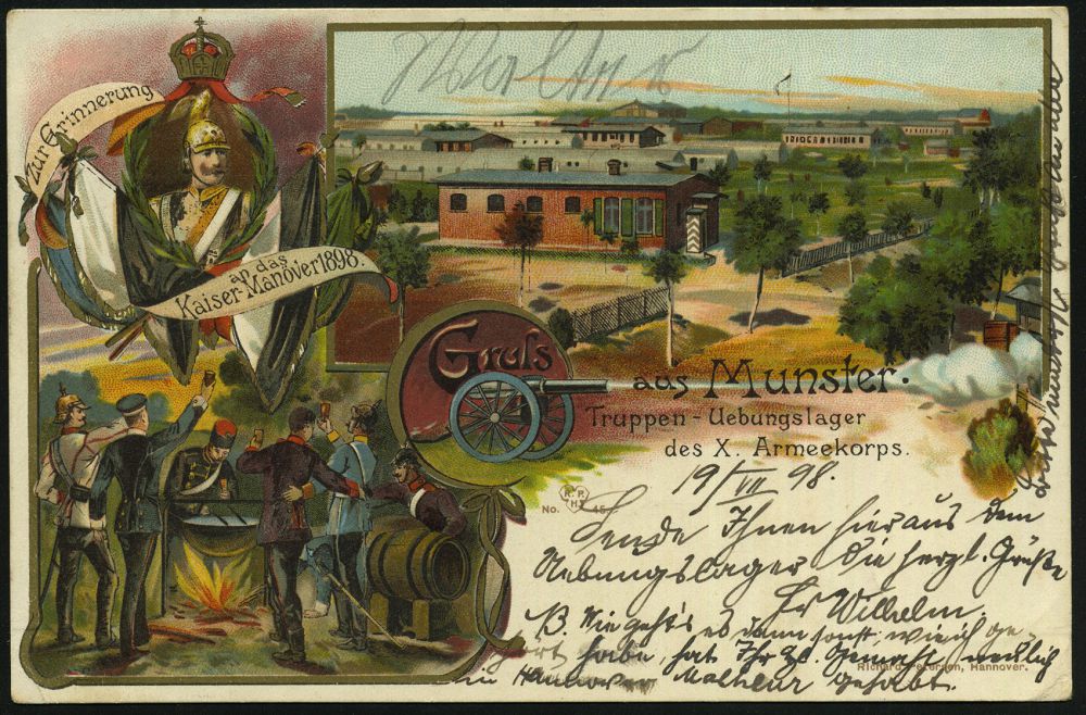 92 | 23 € | DIE REGENTSCHAFT WILHELMS II. 1888 - 1918 : MUNSTER/ (HANNOVER)-/ UEBUNGSPLATZ/ ** 1898 (19.7.) 1K auf seltener Color-Litho-Ak.: Gruß aus Munster, Truppen-Uebungslager des X. Armeekoprs, Zur Erinnerung an das Kaiser- Manöver 1898 (Soldaten mit Bowle, Kaiser Wilhelm II., Lager etc.) Bedarf (n. Mellendorf) | ![]() ![]() | |