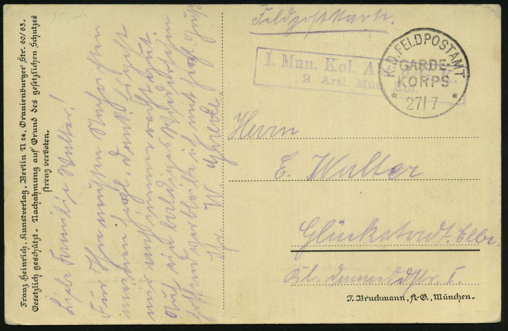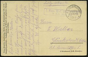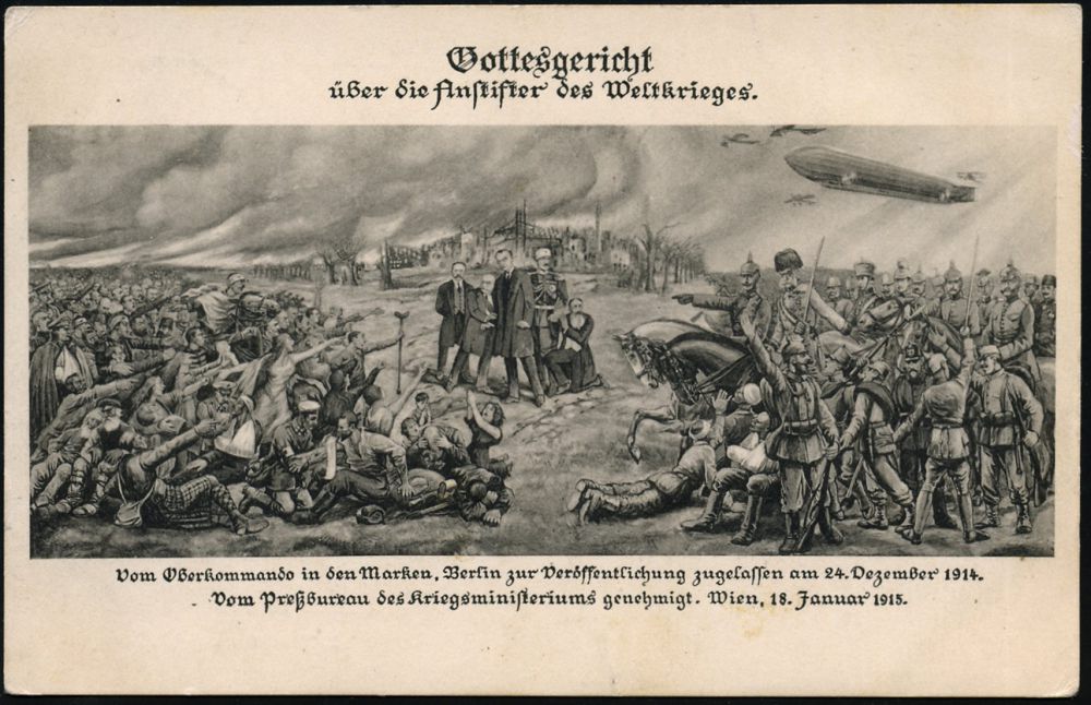 96 | 15 € | DIE REGENTSCHAFT WILHELMS II. 1888 - 1918 : DEUTSCHES REICH 1915 (27.7.) monochrome Propaganda-Ak: "Gottesgericht über die Anstifter der Weltkrieges" = Politiker der Entente,, Kaiser Wilhelm II., Franz-Josepgh mit Soldaten u. Zeppelin links Soldaten u. Zivilisten der Entente, vs. Zensurvermerk: Vom Oberkommando..zugelassen) 1K: K. D. FELDPOSTAMT/ GARDE-/KORPS/** + viol. Ra.2, Feldpost-Kt. n. Glückstadt/Elbe | ![]() ![]() | |