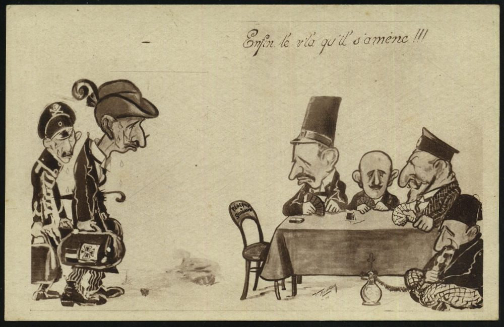 106 | 15 € | DIE REGENTSCHAFT WILHELMS II. 1888 - 1918 : FRANKREICH / TÜRKEI 1915 monochrome Propaganda-Künstler-Ak.: Endlich sind sie da.. Mittelmächte inkl. Türkei waren beim Kartenspiel auf Wilhelm II. u. Kronprinz, die erschöpft ankommen, sign. V. Maréndag (?) (Uhv. J. Maseri, Lausanne = Schweiz) ungebr., selten! | ![]() | |