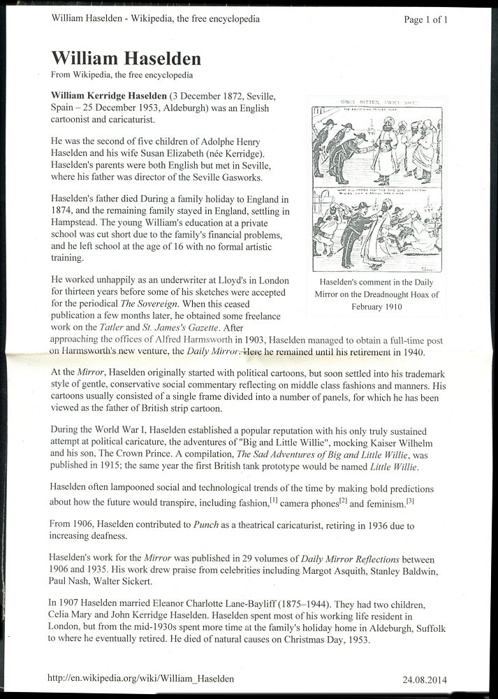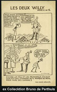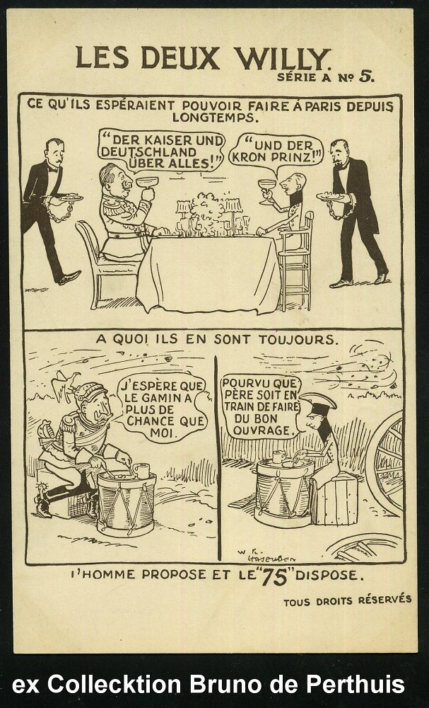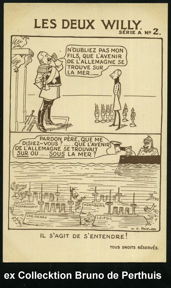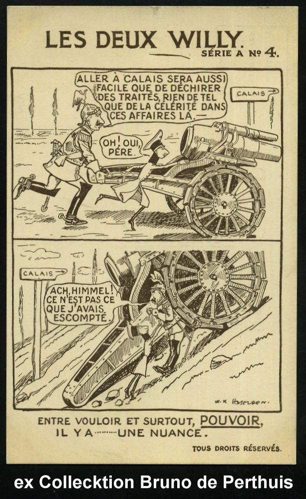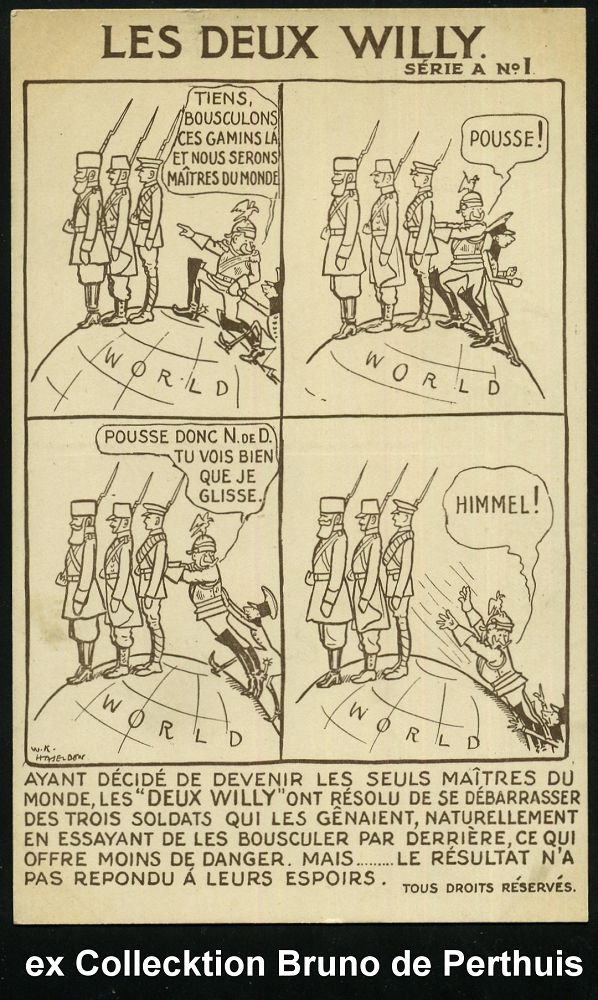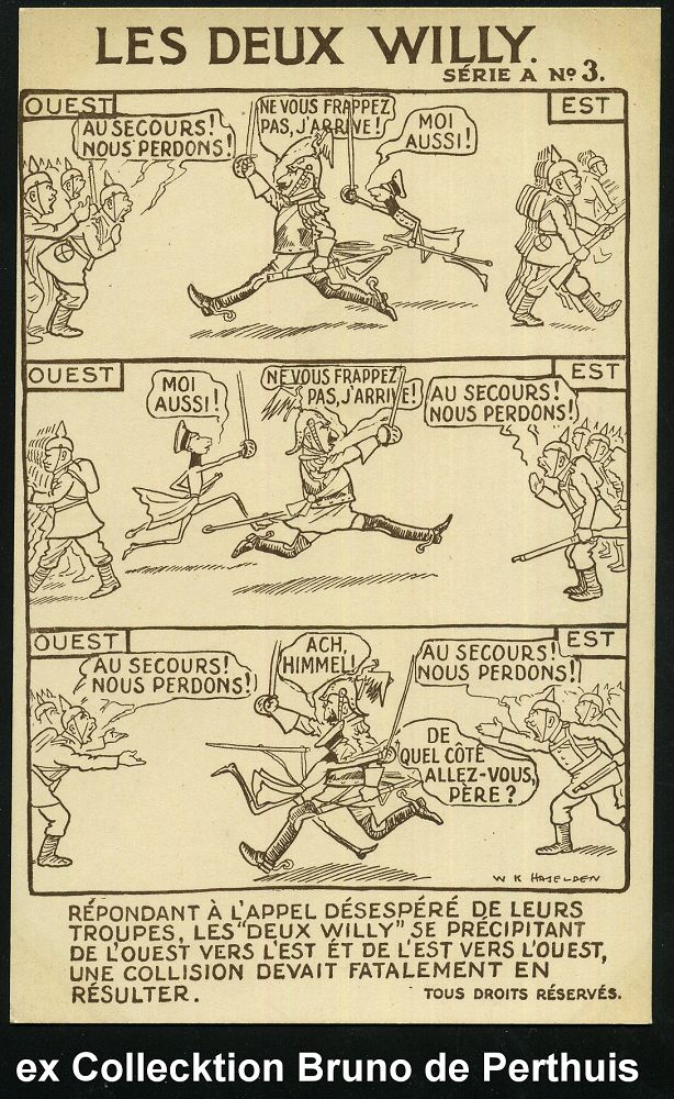 111 | 75 € | DIE REGENTSCHAFT WILHELMS II. 1888 - 1918 : GROSSBRITANNIEN 1914 monochrome Propaganda-Künstler-Ak.: LES DEUX WILLY SERIE A No.1 - 6: Wilhelm II. u. Kronzprinz, der Versuch, die Welt zu beherrschen mit Comic-Bildern, sign. W. K. HASELDEN (1872-1953) "Vater" des britischen Comic-Strip, berühmter Karikaturist (Uhv.Harrison, Jehring & Co., London) ungebr., seltene Serie von 6 Künstler-Ak. komplett! (evetl. Einzelausruf möglich: je 16.- EUR) | ![]() ![]() ![]() ![]() ![]() ![]() ![]() | |