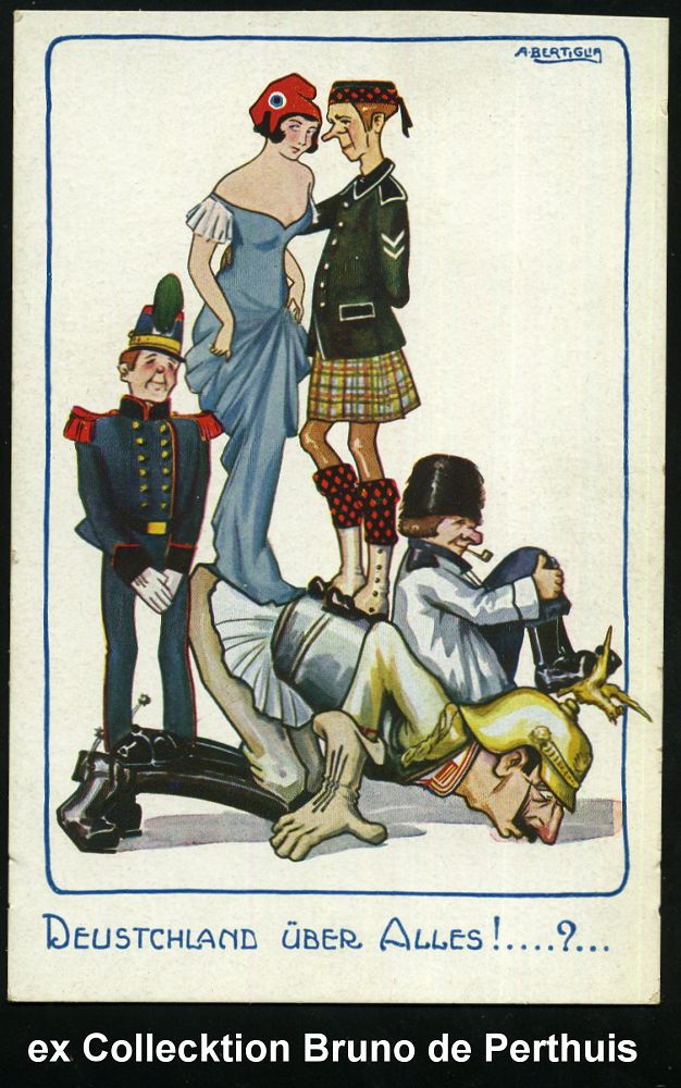 112 | 16 € | DIE REGENTSCHAFT WILHELMS II. 1888 - 1918 : ITALIEN 1915 Color-Propaganda-Künstler-Ak.: DEUTSCHLAND ÜBER ALLES!...? = Wilhelm II. am Boden belastet von 4 Entente-Figuren, sign. A. BERTIGLIA (1891-1973) berühmter italienischer Illustrator, Karikaturist, Künstler (ohne Uhv.) ungebr., selten! | ![]() | |