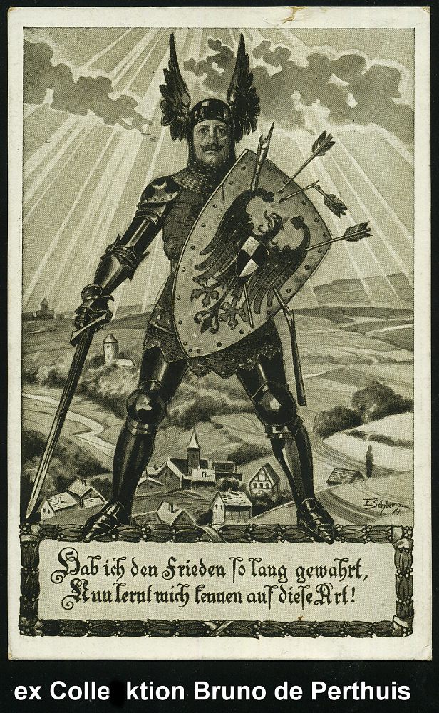 95 | 15 € | DIE REGENTSCHAFT WILHELMS II. 1888 - 1918 : DEUTSCHES REICH 1915 (1.1.) monochrome Propaganda-Künstler-Ak.: Hab ich den Frieden so lang gewahrt.. = Wilhelm II. als Ritter, sign. E. Schlemo (oben kl. Rißchen) Zensurvermerk: Militäramtl. genehmigt. (Uhv: A S M Kriegskarte Nr. 924) 1K: FELD-POSTEXPED/K.B./I./JNFANT. DIVISION (Nr.2606), Feldpost-Kt. n. München (ex Collection B. de Perthuis) | ![]() ![]() | |