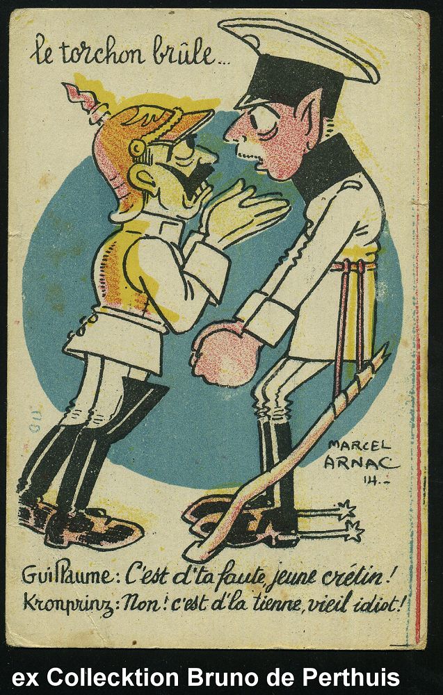 108 | 12 € | DIE REGENTSCHAFT WILHELMS II. 1888 - 1918 : FRANKREICH 1915 (23.2.) Color-Propaganda-Künstler-Ak.: le torchon brûle.. Dialog zwischen Wilhelm II. und Kronprinz, sign. MARCEL ARNAC 14 = Marcel F. L. Bodereau (1886-1931) berühmter Comic-Zeichner, Graphiker, Autor (rs. Text, etw. fleckig, Bugspur) ungebr., selten! | ![]() | |