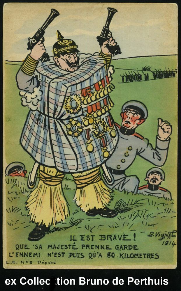 99 | 15 € | DIE REGENTSCHAFT WILHELMS II. 1888 - 1918 : FRANKREICH 1914 Color-Propaganda-Künstler-Ak.: ER IST TAPFER! .. der Feind 80km entfernt = Wilhelm II. mit Matratze als Schutz und mit Orden behangen etc., sign. G: VIGNAC 1914 (Uhv. Librairie de Estampe, Paris) rs. Text (vom Sept. 1916) ungebr., selten! | ![]() | |