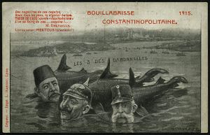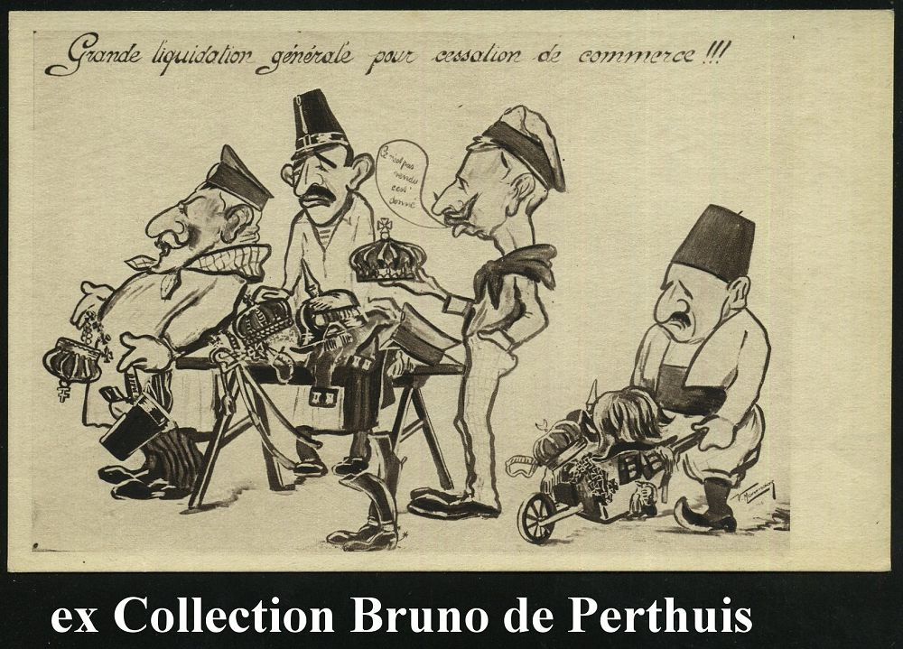 105 | 15 € | DIE REGENTSCHAFT WILHELMS II. 1888 - 1918 : FRANKREICH / TÜRKEI 1915 zweifarbige Propaganda-Künstler-Ak.: Konstantinopler Fischsuppe = Sultan Mehmet V., Kaiser Wilhelm II., Franz-Joseph I. als gestrandete Fische vor den Dardanellen u. Konstantinopel, sign. G. Rousièze, rs. M. Delvaille (Uhv. Impr. L. Bascou, Lyon, rs. M. Delvaille, Lyon) ungebr., | ![]() | |