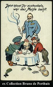 94 | 15 € | DIE REGENTSCHAFT WILHELMS II. 1888 - 1918 : DEUTSCHES REICH 1914 Color-Propaganda-Künstler-Ak.: Jetzt könnt Jhr ausknobeln, wer das Meiste zahlt = Zar, Poincaré, George V. nach dem Karten- Spiel, Wilhelm II. mit Pfeife abwartend (Verlag Herm. Wolff, Berlin S. 59, K.51) ungebr., selten! | ![]() | |