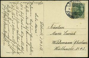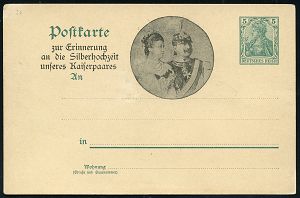 93 | 25 € | DIE REGENTSCHAFT WILHELMS II. 1888 - 1918 : DEUTSCHES REICH 1906 PP 5 Pf. Germania, grün: Erinnerung an die Silberhochzeit unseres Kaiserpaares = Kreisbild des Kaiserpaares , ungebr. (Frech unbekannt, PP 27/E...?) | ![]() | |