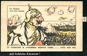 101 | 25 € | DIE REGENTSCHAFT WILHELMS II. 1888 - 1918 : FRANKREICH 1914 Künster-Color-Ak.: Le Kaiser n´est pas content.. (Der Kaiser ist nicht zufrieden) mit Wilhelms großer Nase zum Heruasziehen mit Flugzeugen (französ. Truppen schlagen deutsche Truppen zurück) mit Künstler-Signatur, ungebr., mit Zensur-Freigabevermerk, selten! (Uhv,Imp. Kauffmann, Paris) | ![]() ![]() | |