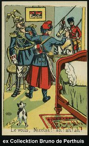 102 | 14 € | DIE REGENTSCHAFT WILHELMS II. 1888 - 1918 : FRANKREICH 1914 Color-Künstler-Ak.: Hierher Nikolaus.. = La France in Uniform hält Wilhelm II. an der Gurgel, Niokaus II als Kosacke , sign. A. Ugd (Uhv. E L D = Edition Le Deley, Paris) ungebr., | ![]() | |