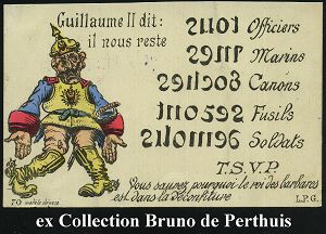 104 | 14 € | DIE REGENTSCHAFT WILHELMS II. 1888 - 1918 : FRANKREICH 1916 Color-Propaganda-Ak.: Wilhelm II sagt: Uns verbleiben.. deutsche Kräfte = Wort- und Zahlenspiel (Uhv. L.P.G.) rs. viol. Ra. (103. Inf. Div.) etc., Feldpost-Kt. n. Villeurbanne | ![]() | |