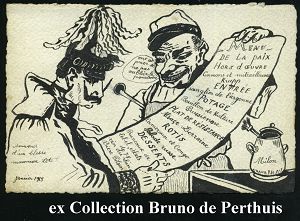 109 | 30 € | DIE REGENTSCHAFT WILHELMS II. 1888 - 1918 : FRANKREICH 1915 (Jan.) orig. handgezeichnete Propaganda-Ak.: MENU DE LA PAIX.. = Franzose hält Wilhelm II. die "Friedens-Speisekarte" hin.., sign. Milon = schwarze Federzeichnung, ungebr., seltenes Unikat! | ![]() | |