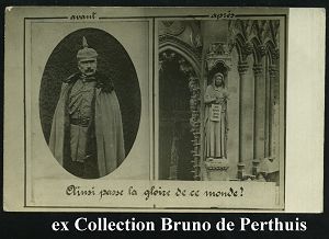 110 | 15 € | DIE REGENTSCHAFT WILHELMS II. 1888 - 1918 : FRANKREICH 1918 Propaganda-Foto-Ak.: Vorher - nachher, so vergeht der Ruhm der Welt = Wilhelm II. In Militär-Uniform, Wilhelm II. als versteinerte Kirchenportal-Figur (ohne Uhv.) ungebr., selten! | ![]() | |