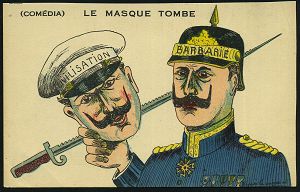 103 | 14 € | DIE REGENTSCHAFT WILHELMS II. 1888 - 1918 : FRANKREICH 1914 Color-Propaganda-Künstler-Ak.: Die Maske fällt = Wilhelm II. mit Maske u. Hut "ZIVILISATION" dahinter "BARBAREI" , sign. ..Laquenet? (ohne Uhv.) ungebr., | ![]() | |