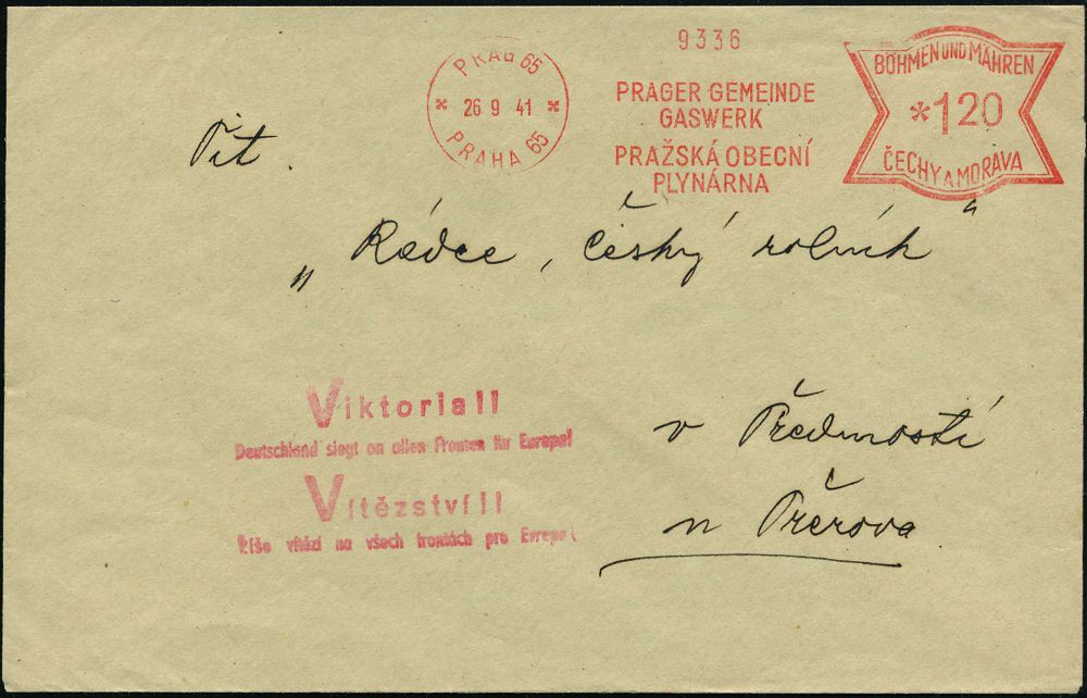 1837 | 25 € | CSR-BESETZUNG 1939 : BÖHMEN & MÄHREN 1941 (26.9.) AFS Francotyp: PRAG 65/PRAHA 65 /PRAGER GEMEINDE/GASWERK.. (zweisprachig) + +roter Propaganda-4L: Viktoria!!/ Deutschland siegt an allen Fronten für Europa!.. (zweisprachig) nur während des siegreichen Vormarsches in Rußland verwendet (bis Spätherbst 1941), Inl.-Bf. (Francotyp COh) | ![]() | |