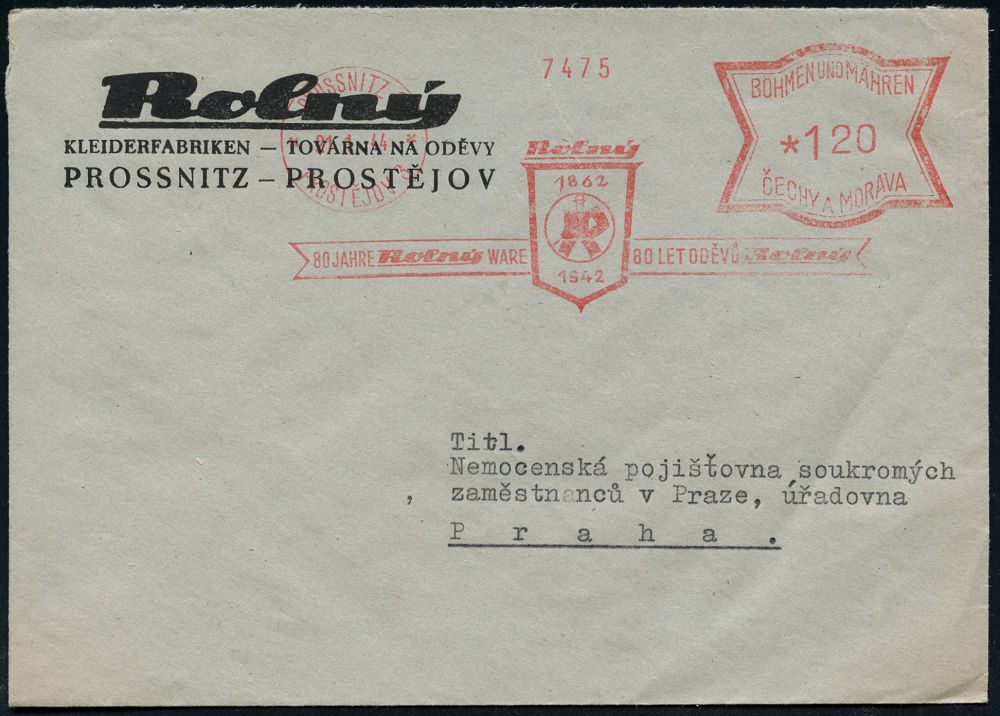 1845 | 20 € | CSR-BESETZUNG 1939 : BÖHMEN & MÄHREN 1944 (21.1.) Jubil.-AFS Francotyp: PROSSNITZ 3/PROSTEJOV 3/Rolny/80 JAHRE Rolny WARE.. (zweisprachig mit Firmen-Logo) seltener Firmen-Fern-Bf. (Dü.COh) | ![]() | |