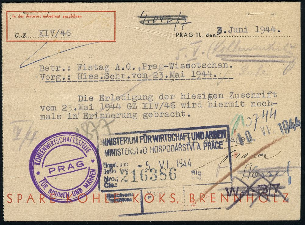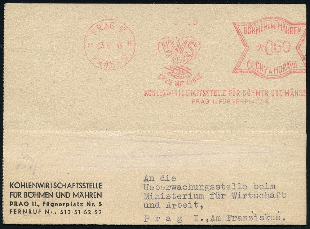 1841 | 28 € | CSR-BESETZUNG 1939 : BÖHMEN & MÄHREN 1944 (3.6.) seltener AFS Francotyp: PRAG 17/PRAHA 17/KWS/ SPARE MIT KOHLE/ KOHLENWIRTSCHAFTSSTELLE FÜR BÖHMEN U. MÄHREN (brennende Kohlen mit Rost, Rauchwolke) seltene Orts-Dienstkarte (Francotyp CO) | ![]() ![]() | |