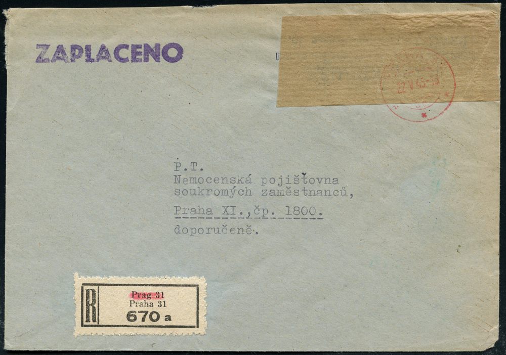1851 | 18 € | CSR-BESETZUNG 1939 : TSCHECHOSLOWAKEI 1945 (24.5.) AFS Francotyp: PRAHA 1/ZENSKA BANKA.. auf aptiertem, altem Firmen-Umschlag: LANDESBANK FÜR BÖHMEN.. ZEMSKA BANKA.. = deutsche Inschrift gestrichen als Notumschlag, frühe Nachkriegs-Orts-Bf. (Francotyp AOh) | ![]() | |
