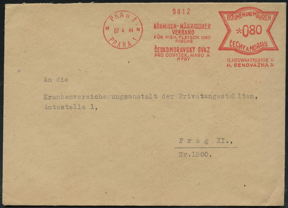 1840 | 18 € | CSR-BESETZUNG 1939 : BÖHMEN & MÄHREN 1944 (15.4.) AFS Francotyp: PRAG 1/PRAHA 1/BÖHMISCH-MÄHR./VERBAND/FÜR VIEH, FLEISCH U./FISCHE klar gest. Orts-Bf. (Francotyp COh) | ![]() | |