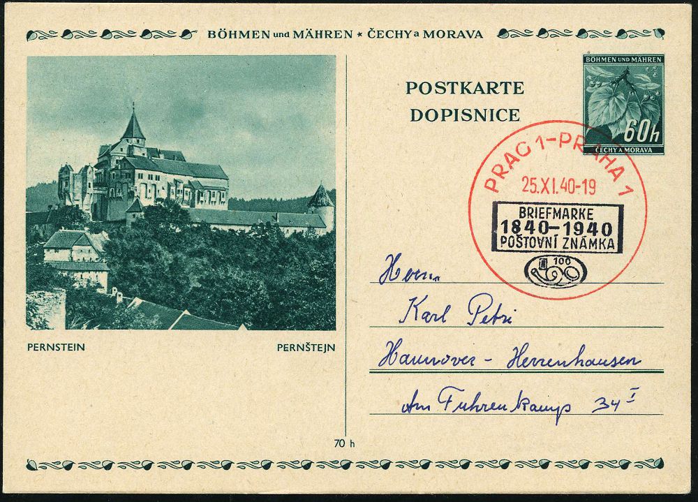 1831 | 18 € | CSR-BESETZUNG 1939 : BÖHMEN & MÄHREN 1940 (25.11.) zweifarbiger SSt.: PRAG 1 - PRAHA 1/BRIEFMARKE/1840 - 1940.. (Posthorn) klar auf Inl.-P 60 H. Burg Pernstein (Mi.P 6/6) | ![]() | |