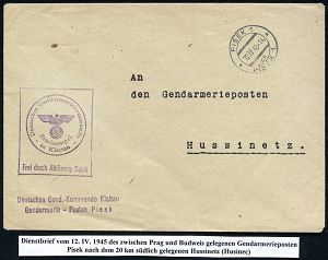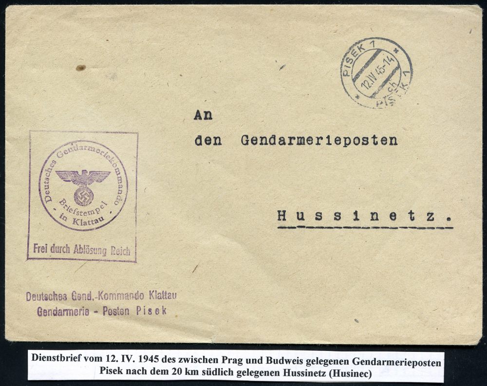 1861 | 35 € | CSR-BESETZUNG 1939 : BÖHMEN & MÄHREN DIENSTPOST 1945 (12.4.) zweisprachiger 2K-Steg: PISEK 1 + viol. Dienst-HdN: Deutsches Gendarmeriekommando/ in Klattau/FdAR + entspr. viol. 2L , klar gest., sehr später Polizei-Dienst-Bf. an Gendarmerie in Hussinetz | ![]() | |