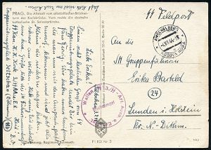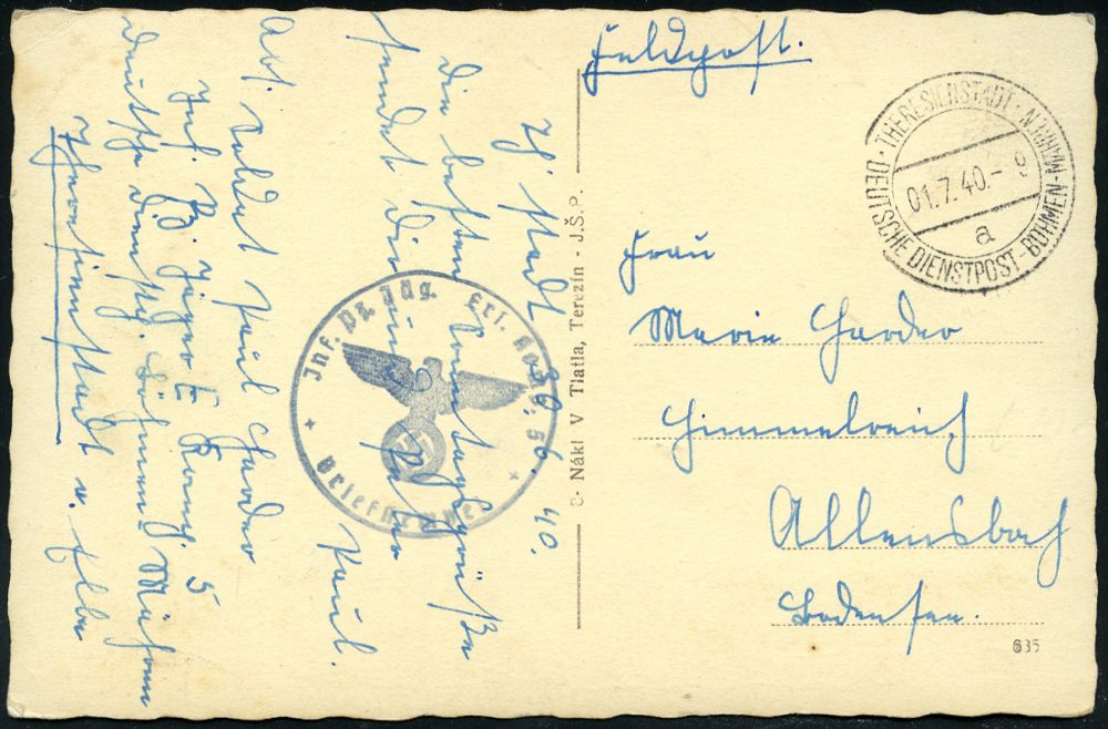 1864 | 18 € | CSR-BESETZUNG 1939 : BÖHMEN & MÄHREN 1940 (1.7.) 2K-Steg: THERESIENSTADT/a/DEUTSCHE DIENSTPOST BÖHMEN-MÄHREN + viol. 1K-NdN: Jnf.(anterie) P(an)z(er) Jäg.(er) Ers. Komp. 5 + hs. Abs., s/w.-Feldpost-Foto-Ak.: Theresienstadt n. Allensbach | ![]() ![]() | |
