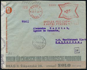 1835 | 38 € | CSR-BESETZUNG 1939 : BÖHNEN & MÄHREN 1941 (3.7.) AFS Francotyp: PRAG 1/ PRAHA 1/ SPOLEK PRO CHEMIOKOU.. + OKW-Zensurstreifen "Geöffnet/c" + roter Zensur-1K "Geprüft/c/55" = Köln (Rie.C-5 a, C-34 + 200 Pkte.) Firmen-Bf.: VEREIN FÜR CHEMISCHE U. METALLURGISCHE PRODUKTION.. vormals SOLO, seltener Ausl.-Zensur-Bf. n. Holland (Dü.AOh) | ![]() ![]() | |