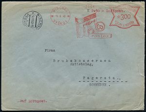 1849 | 30 € | CSR-BESETZUNG 1939 : BÖHMEN & MÄHREN 1940 (14.6.) AFS Francotyp: WISCHAU/ VYSKOV/rollex/rostex, *300 H. + 2K-Steg: WISCHAU.. , rs. OKW-Zensurstreifen: Geöffnet + 3x roter OKW-1K: ..geprüft mit Tilde = Berlin (Rie.B 2 a, B-54, zus. 190 Pkte.) Firmen-Bf.: ZELEZARSKY PRUMYSL.. (rechts Öffnungsmäng.), seltener Ausl.-Flp.-Zensur-Bf. n. Schweden, seltene Portostufe! (Dü.COh) | ![]() ![]() | |