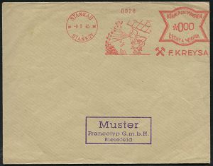1847 | 35 € | CSR-BESETZUNG 1939 : BÖHMEN & MÄHREN 1940 (8.3.) AFS Francotyp-Musterabdruck: STANKAU/ STANKOV/F. KREYSA = Zwerg mit Grubenlampe lockert Gestein mit seiner Puste! (u. 2 Bergbauhämmer) seltener Francotyp-Muster-Bf., ungewöhnliches Motiv! (Francotyp COh) | ![]() ![]() | |