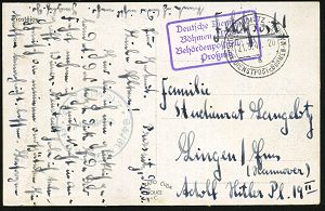 1863 | 14 € | CSR-BESETZUNG 1939 : BÖHMEN & MÄHREN 1940 (21.3.) 2K-Steg: PRERAU/a/DDP-BÖHMEN-MÄHREN + blauer 1K-HdN: 4. (M. G.) Kompanie Jnf. Ersatz-Bataillon 470 , klar gest. s/w.-Feldpost-Ak.: tschech. Trachtenpaar n. Wachenheim | ![]() ![]() | |