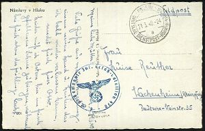 1859 | 12 € | CSR-BESETZUNG 1939 : BÖHMEN & MÄHREN DIENSTPOST 1940 (21.5.) 2K-Steg: OLMÜTZ/a/DDP-BÖHMEN-MÄHREN + viol. Ra.4: Deutsche Dienstpost/ Böhmen-Mähren/Behördenpoststelle 33/Proßnitz + blauer 1K-HdN: Sch. Fl.(ieger) Ausb. Regt. 43/ 2. (Schüler) Komp. , klar gest. s/w.-Feldpost-Ak.: Prostejov (= Proßnitz) n. Lingen/Ems | ![]() ![]() | |
