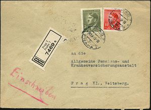 1844 | 25 € | CSR-BESETZUNG 1939 : BÖHMEN & MÄHREN 1945 (12.4.) Hitler 80 H. u. 3 K., satzreine Frankatur je 2K-Steg: PRAG 7/ PRAHA 7 + schw. RZ: Prag 7/Praha 7/s , rs. Vordr.: ..Auswanderungsfonds für Böhmen u. Mähren.. = unkenntlich gemacht! , sehr später Orts-R-Bf., rs. AS (Mi.94, 102) | ![]() ![]() | |