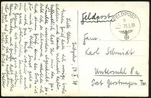 1801 | 16 € | CSR-BESETZUNG 1939 : DEUTSCHES REICH / CSR 1939 (29.3.) 1K: FELDPOST/b/--- + hs. Ortsangabe "Pribyslav" , s/w.-Feldpost-Ak.: Pribyslav n. Untersuhl = Besetzung von "Böhmen & Mähren" durch die deutsche Wehrmacht (Bo.1 b, 35.- EUR, 2009) | ![]() ![]() | |