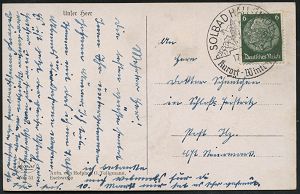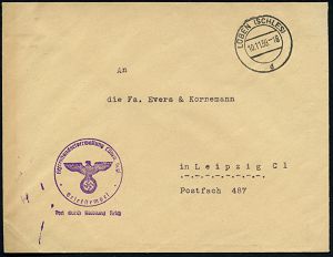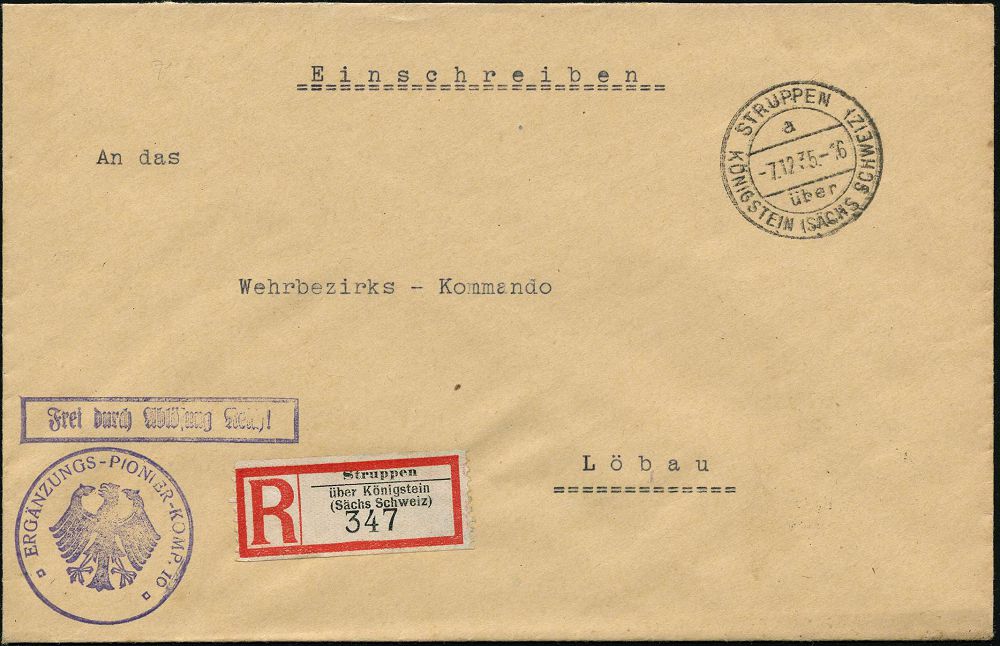 1910 | 20 € | DEUTSCHE WEHRMACHT 1933 - 31.8.1939 : STRUPPEN/ a/ über/ KÖNIGSTEIN (SÄCHS SCHWEIZ) 1935 (7.12.) 2K-Steg = PSt.I + RZ: Struppen/über Königstein/ (Sächs. Schweiz) + viol. Ra.: FdAR + 1K-HdN: ERGÄNZUNGS-PIONIER-KOMP.10 (noch Weimarer Adler!, Reichswehr bis 15.3.1935), Inl.-Dienst-R-Bf. = sehr kleiner Standort! (ab 16.3.35 Wehrpflicht !) | ![]() | |
