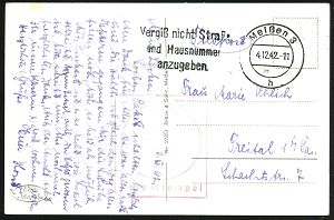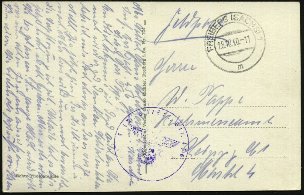1894 | 12 € | DEUTSCHE WEHRMACHT 1933 - 31.8.1939 : FREIBERG (SACHS) 1/ m 1940 (28.12.) 2K-Steg + viol. 1K-HdN: Inf. Ers. Btl. 456 + hs. Abs., s/w.-Feldpost-Ak.: Hausen-Kaserne (Hauptwache) n. Leipzig | ![]() ![]() | |