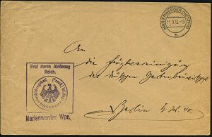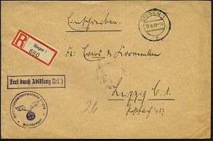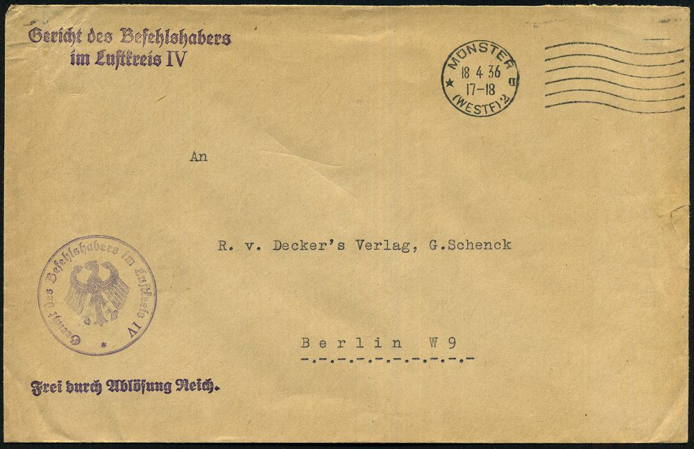 1903 | 15 € | DEUTSCHE WEHRMACHT 1933 - 31.8.1939 : MÜNSTER/ *II/ (WESTF) 2 1936 (18.4.) MaWellenSt. (6 Wellen rechts) + viol. 1L: Frei durch Ablösung Reich + viol. 1K-HdN: Gericht des Befehlshabers im Luftkreis IV (noch Weimarer Adler) + entspr. viol. 2L., Wehrmachts-Dienstbf. (rechts kl. Riß) n. Berlin = eigene Wehr-Gerichtsbarkeit, im Krieg mit Standgerichten! | ![]() | |
