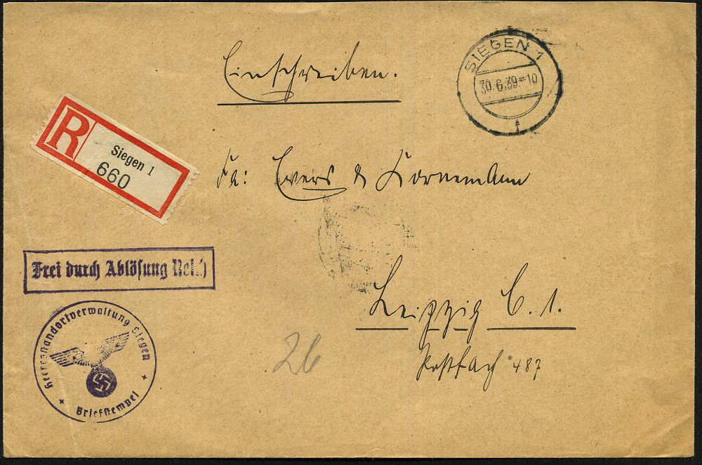 1907 | 18 € | DEUTSCHE WEHRMACHT 1933 - 31.8.1939 : SIEGEN 1/ f 1939 (30.6.) 2K-Steg + RZ: Siegen 1 + viol. Ra.: FdAR + viol. 1K-HdN: Heeresstandortverwaltung Siegen (NS-Adler) Wehrmachts-Dienst-R-Bf. n. Leipzig | ![]() | |