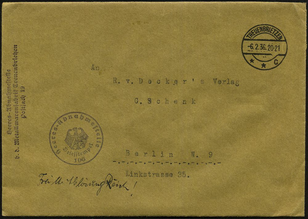 1911 | 15 € | DEUTSCHE WEHRMACHT 1933 - 31.8.1939 : TREUENBRIETZEN/ **c 1936 (6.2.) 1K-Brücke + viol. 1K-HdN: Heeres-Abnahmestelle/106 (noch Weimarer Adler) + viol. 3L: Heeres-Abnahmestelle/b. d. Metallwarenfabrik Treuenbrietzen.. + hs. "Frei lt. Ablösung Reich!", klar gest. Wehrmachts-Dienstbf. mit Rüstungs-Bezug! (n. Berlin) | ![]() | |