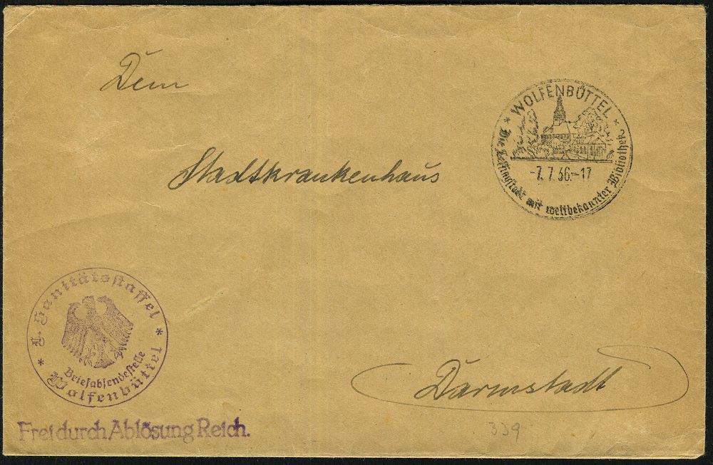 1914 | 15 € | DEUTSCHE WEHRMACHT 1933 - 31.8.1939 : WOLFENBÜTTEL/ Die Lessingstadt mit weltberühmter Bibliothek 1936 (7.7.) HWSt = Schloß (= Lessing-Stätte) + viol. 1K-HdN: 1. Sanitätsstaffel/ Wolfenbüttel (noch Weimarer Adler) + 1L: Frei durch Ablösung Reich, klar gest. Wehrmachts-Dienstbf. (Bo.2 , nur 1936-38 verwendet) | ![]() | |
