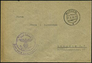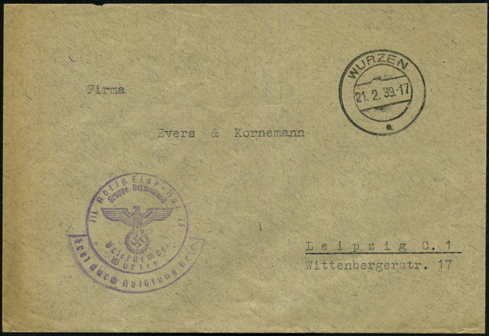 1915 | 12 € | DEUTSCHE WEHRMACHT 1933 - 31.8.1939 : WURZEN/ a 1939 (21.2.) 2K-Steg + viol. Segment-HdN: III. Abtlg. Flak-Rgt. 13/ Wurzen/FdAR (NS-Adler) klar gest. Wehrmachts-Dienstbf. | ![]() | |