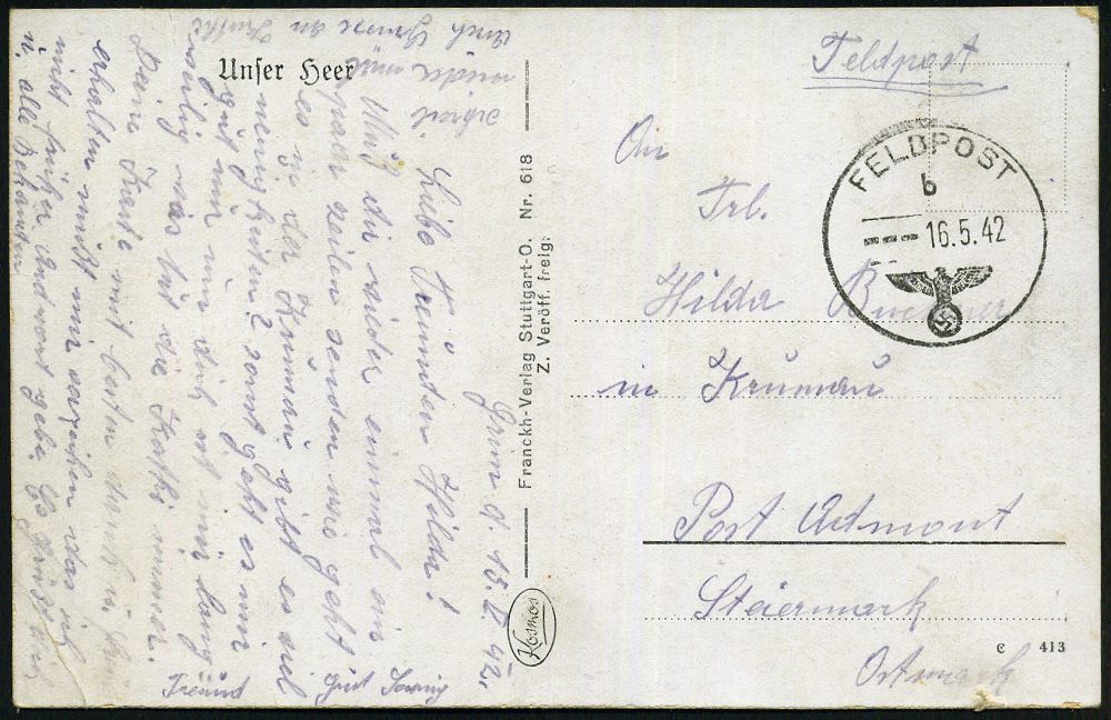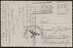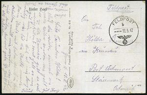 1919 | 10 € | DEUTSCHE WEHRMACHT 1933 - 31.8.1939 : DEUTSCHES REICH 1942 (16.5.) 1K: FELDPOST/b/--- auf s/w.-Foto-Feldpost-Ak: Leichter Granatwerfer + 1K: FELDPOST/b/--- (kl. Kerbe, Bugspur) Feldpost-Kt. n. Bad Pyrmont (Franck-Verlag, Stuttgt.) | ![]() | |