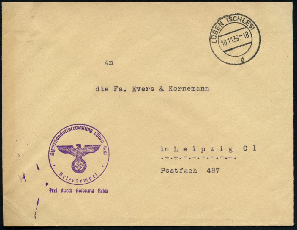 1899 | 14 € | DEUTSCHE WEHRMACHT 1933 - 31.8.1939 : LÜBEN (SCHLES)/ d 1939 (10.11.) 2K-Steg + viol. 1K-HdN: Heeresstandortverwaltung Lüben, Schl./FdAR (NS-Adler) Wehrmachts-Dienstbf. aus dem 1. Kriegsjahr | ![]() | |