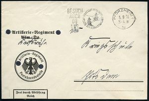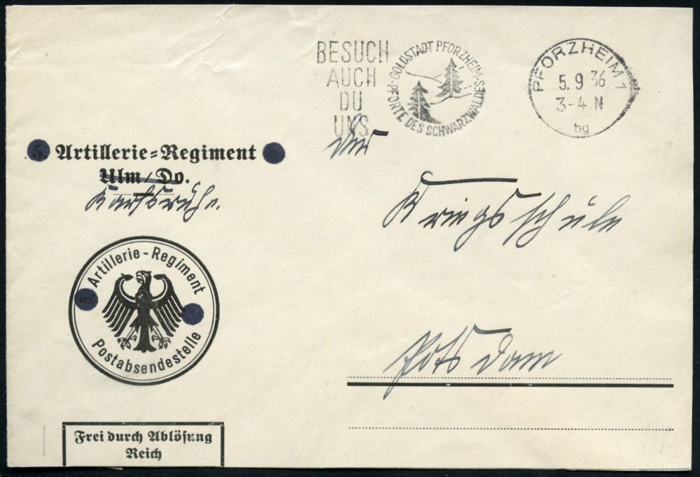1905 | 15 € | DEUTSCHE WEHRMACHT 1933 - 31.8.1939 : PFORZHEIM 1/ bg/ GOLDSTADT PFORZHEIM.. 1936 (5.9.) MWSt (2 Tannen) auf Wehrmachts-Dienstbf.: FdAR/ Artillerie-Regiment ("5." überdruckt, aber noch Weimarer Adler!) = aptiert! (Bf. etw. verkürzt) klar gest.! (Bo.11 A II) | ![]() | |