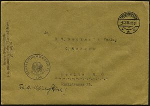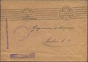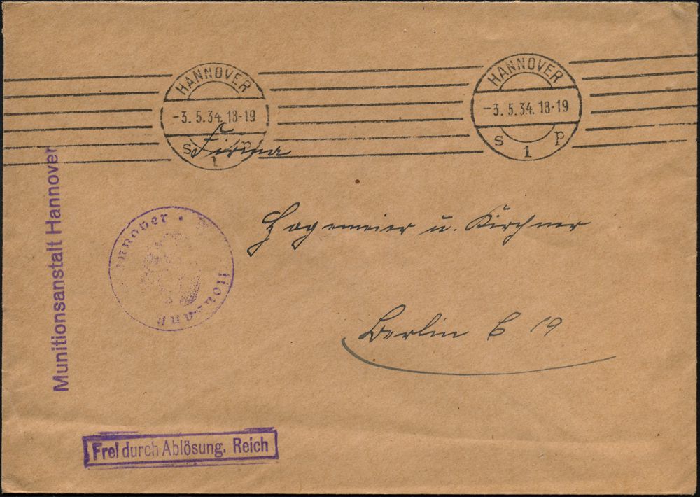 1898 | 12 € | DEUTSCHE WEHRMACHT 1933 - 31.8.1939 : HANNOVER/ s1p 1934 (3.5.) BdMastrichSt + 1L: Munitionsanstalt Hannover + 1K-HdN (Mitte etw. undeutl.) + Ra.: FdAR, Reichswehr-Dienstbf. (Reichswehr bis 16.3.1935) | ![]() | |