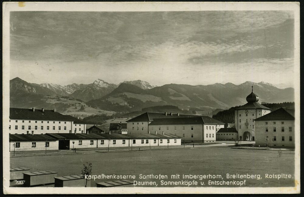 1908 | 12 € | DEUTSCHE WEHRMACHT 1933 - 31.8.1939 : SONTHOFEN/ d 1943 (5.4.) 2K-Steg auf s/w.-Foto-Ak.: Karpathenkaserne = Gebirgsjäger-Kaserne , klar gest. Feldpost-Kt. n. Kirchberg (Verl. Kaps. Friedl, Kasernen-Pächter) | ![]() ![]() | |