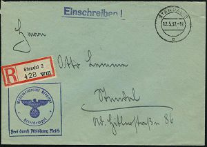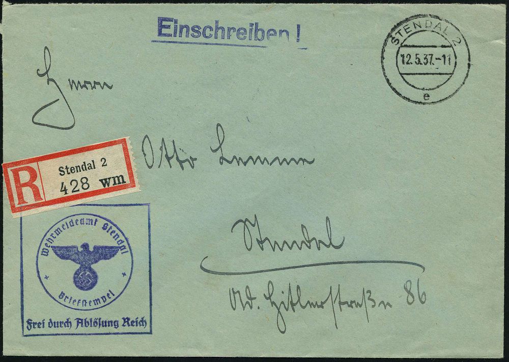 1909 | 25 € | DEUTSCHE WEHRMACHT 1933 - 31.8.1939 : STENDAL 2/ e 1937 (12.5.) 2K-Steg + viol. Ra.: Wehrmeldeamt Stendal/.. FdAR + Selbstbucher-Dienst-RZ: Stendal 2 / w m = w ehr-meldeamt, Orts-Selbstbucher-Orts-R-Bf. | ![]() | |