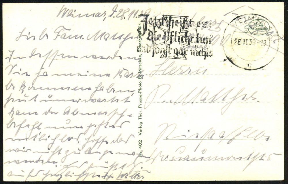 1912 | 18 € | DEUTSCHE WEHRMACHT 1933 - 31.8.1939 : WEIMAR 1/ c/ Jetzt heißt es:/ Die Pflicht tun/ und sonst gar nichts 1939 (28.11.) seltener MWSt (Eisernes Kreuz) auf s/w.-Feldpost-Foto-Ak.: Kaserne I./A.(rtillerie) R.(egmt.) 73 (mit Reichskriegsflagge) n. Riesa (Bo.S 432 A, nur 23.10.1939 - 26.2.1940 verwendet!) | ![]() ![]() | |