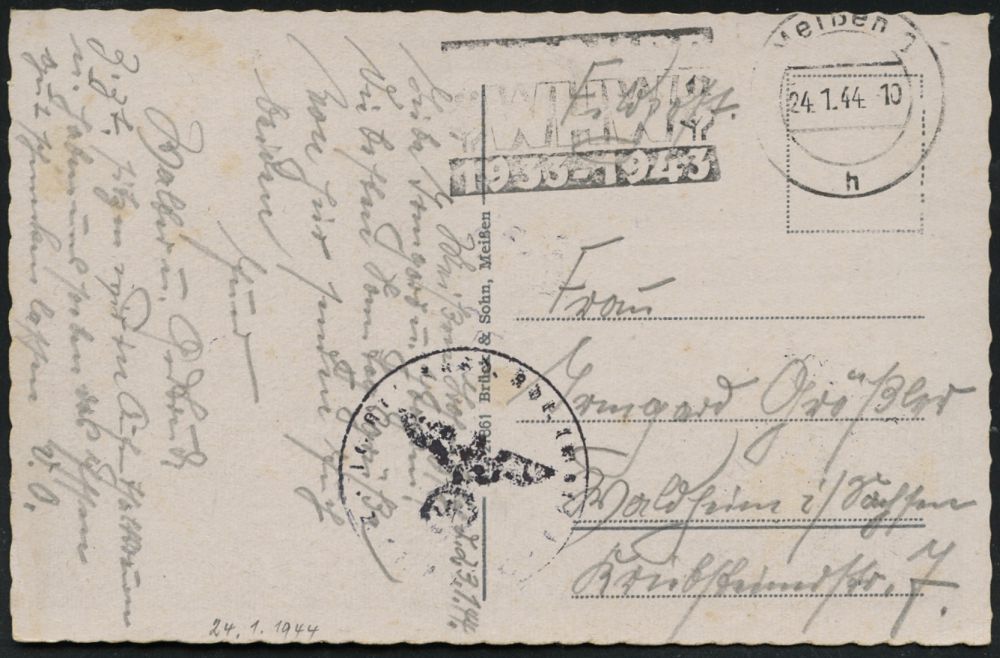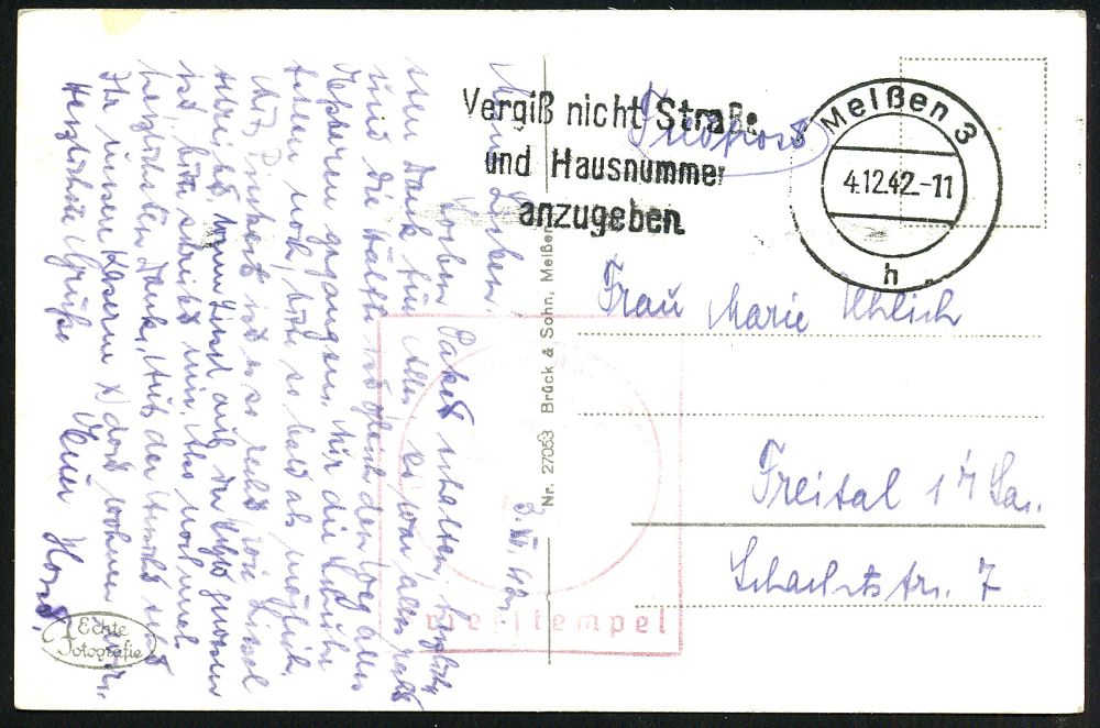 1902 | 20 € | DEUTSCHE WEHRMACHT 1933 - 31.8.1939 : Meißen 3 1942/44 2 verschiedene s/w.-Foto-Ak.: Artillerie-Kaserne, Meißen-Bohnitzsch , je als Feldpost-Kt. gebr. (2 verschied. Briefstpl., beide Uhv. Brück & Sohn, Meißen) 2 Belege (Einzelausruf möglich: je 12.- EUR) | ![]() ![]() ![]() ![]() | |