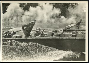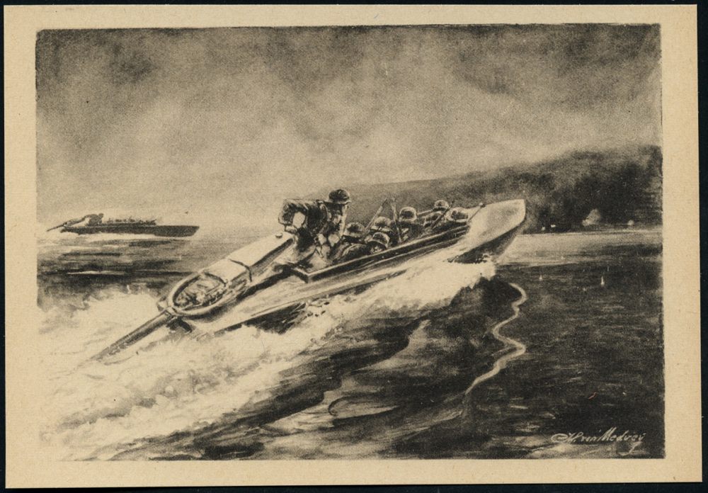1929 | 20 € | DEUTSCHE WEHRMACHT 1933 - 31.8.1939 : DEUTSCHES REICH 1939 (ca.) s/w.-Foto-Ak.: Unsere Wehrmacht "Sturmboote in Fahrt", Foto: Pollmann bzw. Künstler-Feldpost-Ak.: Sturmboote, sign. H. v. Medvey (Pioniere) je ungebr., Einzelausruf möglich: je 11.- EUR (Uhv. Verlag Schwerdtfeger, Berlin bzw. OKW) | ![]() ![]() | |